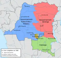 Lumumba, s'enfuyant vers Stanleyville est arrêté début décembre par Mobutu et livré à Moïse Tshombe qui le fait assassiner le [3]. Un gouvernement rival pro-Lumumba se forme entre-temps dans l'Est du pays, dirigé par Pierre Mulele et Antoine Gizenga et soutenu par l'URSS. Avec l'aide des forces de l'ONU et d'anciens officiers blancs, Mobutu parvient à reconquérir l'ensemble du territoire au cours des années suivantes. Mulele est tué et Gizanga emprisonné tandis que Moïse Tshombe est exilé. De nouvelles élections n'auront finalement lieu dans le pays qu'en 1965 après la mise en place de la constitution de la première république, dite Constitution de Luluabourg, adoptée par référendum le .