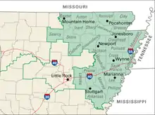 Jonesboro est la plus grande ville, qui abrite une importante industrie de transformation alimentaire avec des entreprises telles que Nestlé et Frito-Lay implantées ici. Jonesboro abrite également l'Université d'État de l'Arkansas (ASU)-Jonesboro. Alors que Jonesboro lui-même arbore une tendance républicaine, avec certains des comtés des collines, il est contrebalancé par la forte présence Démocrate dans le delta du fleuve Mississippi dominé par les Afro-Américains.