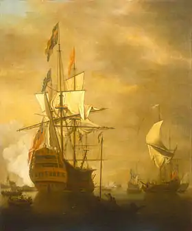 Le Soleil Royal, lancé en 1669. Vaisseau-amiral de Louis XIV au début de la Guerre de la Ligue d’Augsbourg, il est activement engagé en opération, endommagé à La Hougue en 1692 et détruit peu après lors de son échouement.