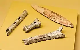 Pour la fabrication des armes, les premiers Hommes modernes en Europe ont taillé des pointes de lance en utilisant principalement des os et des bois de cervidé, probablement parce que ces matériaux étaient abondants et solides ; ces mêmes matériaux sont entrés aussi dans la fabrication de javelots[51].