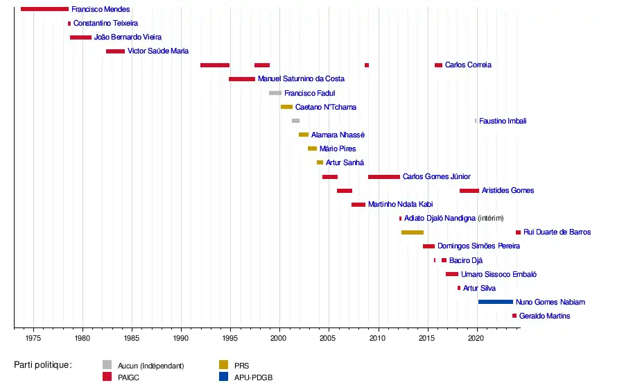 La Constitution a été suspendue par João Bernardo Vieira après son coup d'État du qui a renversé Luís Cabral. Il n'y a pas de Premier ministre entre 1980 et 1982, ni entre 1984 et 1991.