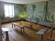Dans la chambre de l'étage à l'angle sud, un ancien papier peint panoramique très rare, daté des années 1810, est exposé dans un état exceptionnel. S'il est sûr qu'il n'a pas été imprimé par la manufacture Jean Zuber et Cie[2], il est parfois attribué sans preuve à la manufacture Dufour[3] car cette fabrique a imprimé les plus célèbres dans le domaine du papier peint panoramique. Si elle n'est pas identifiée, la manufacture de papier peint qui l'a imprimé, détenait un grand savoir-faire et a probablement choisi ce thème religieux car il venait d'être popularisé par l'opéra Joseph d'Etienne-Nicolas Méhul. Cadeau présumé au curé, d'un prince de la Maison d'Arenberg (richissime et importante famille propriétaire terrienne de la région), il représente la vie de Joseph, fils de Jacob, petit-fils d’Abraham, de la Religion abrahamique (Religion du Livre) sous forme de fresque en huit tableaux. Il comporte d'importants mélanges anachroniques de références à la Bible, à la civilisation gréco-romaine, à la Révolution française, à l'exotisme et la campagne d'Égypte de 1798-1801 du général Bonaparte (futur empereur Napoléon Ier), ainsi qu'à la Franc-maçonnerie[4],[5].