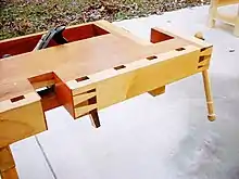 La presse à épaulement est un modèle ancien de presse d'établi. L'avantage de cette conception est qu'elle permet d'effectuer le serrage directement derrière la vis. Cela permet un serrage vertical sans entrave pour la coupe des queues d'aronde et autres opérations similaires. Il y a aussi généralement un peu de jeu dans la fixation de la vis et du mors, ce qui permet de serrer des pièces coniques. Il s'agit d'un étau qui doit être conçu dès le départ pour l'établi, car il est difficile de l'adapter à un établi existant. Le principal inconvénient de l'étau à épaulement est sa fragilité, à moins que le "bras" ne soit fixé au "capuchon d'extrémité" à l'aide d'une queue d'aronde ou d'une articulation, généralement collée ou "goupillée" pour éliminer tout mouvement de rotation autour de l'articulation, sinon il est assez facile de le casser avec une grosse vis d'établi en acier. Mais on ne devrait jamais avoir à exercer une telle force. Certains menuisiers disent que le grand étau les gêne dans certains travaux, d'autres le trouvent discret. L'étau à épaulement comporte implicitement une butée de rabotage intégrée, formée par l'intersection de la mâchoire et de l'entretoise de la mâchoire, et qui permet à l'étau à épaulement de remplir plusieurs fonctions, comme l'assemblage de longues planches avec un "esclave d'établi" pour tenir l'extrémité opposée. Autrefois, un crochet et un valet remplissaient la même fonction.