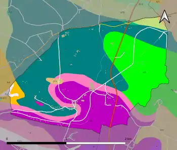 L'occupation des sols de la commune, telle qu'elle ressort de la base de données européenne d’occupation biophysique des sols Corine Land Cover (CLC), est marquée par l'importance des territoires agricoles (87,2 % en 2018), une proportion identique à celle de 1990 (87,2 %). La répartition détaillée en 2018 est la suivante : zones agricoles hétérogènes (73,1 %), prairies (14,1 %), forêts (12,7 %)[30]. L'évolution de l’occupation des sols de la commune et de ses infrastructures peut être observée sur les différentes représentations cartographiques du territoire : la carte de Cassini (XVIIIe siècle), la carte d'état-major (1820-1866) et les cartes ou photos aériennes de l'IGN pour la période actuelle (1950 à aujourd'hui)[Carte 3].