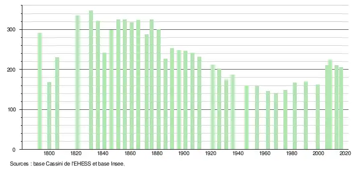 | L'évolution du nombre d'habitants est connue à travers les recensements de la population effectués dans la commune depuis 1793. Pour les communes de moins de 10 000 habitants, une enquête de recensement portant sur toute la population est réalisée tous les cinq ans, les populations légales des années intermédiaires étant quant à elles estimées par interpolation ou extrapolation[8]. Pour la commune, le premier recensement exhaustif entrant dans le cadre du nouveau dispositif a été réalisé en 2008[9]. En 2016, la commune comptait 206 habitants[Note 1], en diminution de 11,21 % par rapport à 2010 (Gironde : +6,88 %, France hors Mayotte : +1,84 %). |