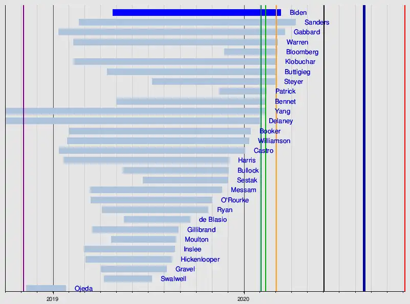 - Tulsi Gabbard, représentante des États-Unis pour l'état d'Hawaii, retire sa candidature le . Elle annonce son soutien à Joe Biden[30].