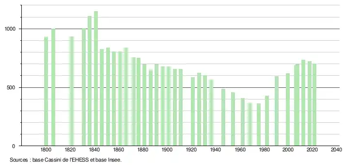 L'évolution du nombre d'habitants est connue à travers les recensements de la population effectués dans la commune depuis 1800. Pour les communes de moins de 10 000 habitants, une enquête de recensement portant sur toute la population est réalisée tous les cinq ans, les populations légales des années intermédiaires étant quant à elles estimées par interpolation ou extrapolation[18]. Pour la commune, le premier recensement exhaustif entrant dans le cadre du nouveau dispositif a été réalisé en 2007[19].