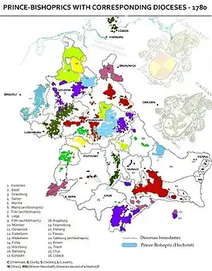 La matricule d'Empire, arrêtée à la diète de Worms en 1521, recense les trois électeurs ecclésiastiques et quatre États impériaux au rang de princes-archevêques (Erzstifte) : à Magdebourg (avec Halberstadt), Salzbourg, Besançon et Brême. De plus, elle connaît au total 46 princes-évêques catholiques, par exemple à Bâle, Cambrai (Cambrésis), Genève, Hildesheim, Liège (Lüttich), Münster, Paderborn, Sion (Valais), Strasbourg, Trente et Utrecht, ainsi que les Trois-Évêchés lorrains de Metz, Toul et Verdun. Le nombre a été réduit considérablement au cours de la réforme protestante : après la paix de Westphalie de 1648, beaucoup de principautés épiscopales ont été sécularisées, avant tout à l'avantage des grands États tels que le Brandebourg-Prusse. 23 d'entre elles resteraient, parmi lesquelles l'évêché protestant de Lübeck et la principauté épiscopale d'Osnabrück gouverné alternativement par des évêques catholiques et luthériens.