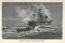 Jules Noël : Incendie et naufrage du vaisseau Le Prince en 1752 (gravure, 1877)