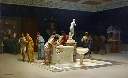 Dès le début du principat, le Sénat ordonne qu'une libation au genius d'Auguste soit effectuée à tous les banquets. Après 12 av. J.-C., son genius est joint au culte des Lares des carrefours dans Rome, qui prennent le nom de « Lares Augustaux »[79]. Peu à peu, Auguste est associé à une divinité d'origine orientale, Roma. De nombreux monuments sont érigés dans tout l'Empire dédiés à Roma et Auguste, achevant la sacralisation de l'empereur de son vivant. Le culte voué à Auguste s'amplifie après sa mort, une fois qu'il est officiellement divinisé, et est développé par ses successeurs[80].