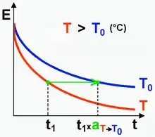 Le principe d’équivalence temps-température stipule que le passage de T à T0 (soit un changement de température) revient à multiplier l’échelle du temps par un facteur constant uniquement fonction des deux températures T et T0[3]