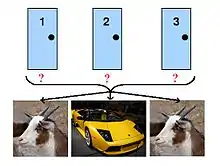 - Soient trois portes, l'une cache une voiture, les deux autres une chèvre. Les prix sont répartis par tirage au sort.