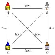 ![]() Le chemin ABDCA de longueur 4+2+5+3 = 14 km. |