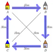 - Problème du voyageur de commerce asymétrique : Étant donné un ensemble de nœuds et de distances pour chaque paire de nœuds, trouver un cycle de longueur minimale qui visite chaque nœud exactement une fois. Cette fois-ci la distance entre deux nœuds et d'une arête n'est pas forcément la même qu'on aille de à ou bien de à .