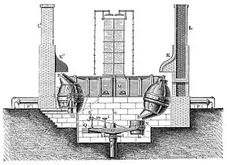 Four à réverbère expérimental de Bessemer. L'injection d'air (le ventilateur est visible) censée améliorer la post-combustion des fumées décarburait aussi la fonte.