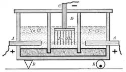 L'appareil original est divisé en deux types de cellules séparée par des parois en ardoise. Le premier type, à droite et à gauche du schéma, utilise un électrolyte de chlorure de sodium en solution, une anode en graphite (A), et une cathode en mercure (M). L'autre type de cellule, au centre du schéma, utilise un électrolyte d'hydroxyde de sodium en solution, une anode de mercure (M), et une cathode en fer (D). À noter que l'électrode de mercure est partagée entre les trois compartiments.