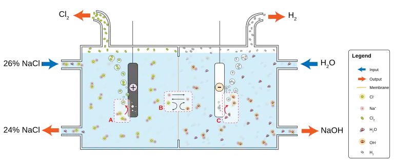 Généralement ce procédé est réalisé avec de la saumure de chlorure de sodium, dans ce cas les produits sont l'hydroxyde de sodium, le dihydrogène et le dichlore. On parle alors plus précisément d'électrolyse chlore-soude. Si du chlorure de calcium ou du chlorure de potassium sont utilisés, les produits seront alors en plus du dihydrogène et du dichlore, de l'hydroxyde de calcium et de l'hydroxyde de potassium respectivement.