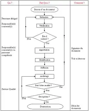 Le processus représente le Quoi, la procédure le Qui fait Quoi Quand, et les deux sont complétés par le mode opératoire qui définit le Comment[2] en suivant la grille d'analyse du QQOQCCP.
