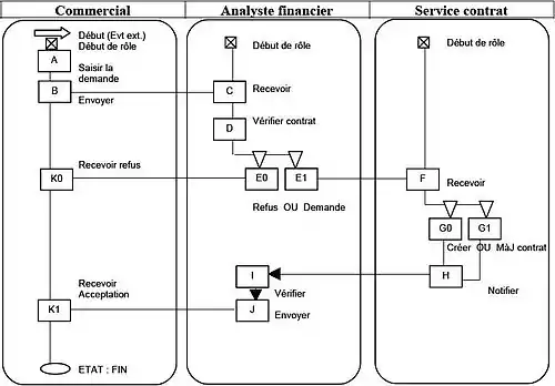Les activités A à K1 représentent une procédure d'entreprise d'une « demande de crédit ». Les activités sont attribuées selon des rôles (le service des contrats n'a pas les mêmes activités que l'analyste financier). Ces mêmes activités ont un ordonnancement logique et l'ensemble des activités ordonnées permet de remplir l'objectif global qui est de satisfaire ou rejeter la demande de crédit.
