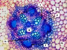 Coupe transversale du cylindre vasculaire d'un haricot (Phaseolus). PC, Parenchyme cortical ou cortex; E, Endoderme; P, Péricycle; X, Xylème; F, Phloème; Pr, Procambium; M, Médulla.