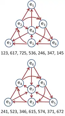 Il y a de nombreuses autres tables de multiplication possibles[4],[12] ; ces tables sont caractérisées par leur plan de Fano[13],[14], lesquels sont montrés ci-contre pour les deux tables qui ont été détaillées. Les nombres sous ces diagrammes (donnant la liste des 7 droites du plan) correspondent aux indices de sept produits indépendants, à interpréter comme ijk → ei × ej = ek. La table de multiplication complète s'obtient à partir du diagramme en suivant la "droite" reliant les deux points à multiplier (le cercle central est aussi une droite), le signe étant donné par les flèches. Par exemple, la première rangée de la formule précédente, donnant la composante en e1 du produit vectoriel, est obtenue en suivant les trois chemins connectés à e1 dans le second diagramme : le chemin circulaire e2 × e4, la diagonale e3 × e7, et le borde6 × e1 = e5, réarrangés en utilisant une des identités précédentes comme :