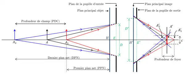 Dans les cas les plus courants en photographie, la distance de mise au point est très supérieure à la focale et l'objectif peut être modélisé de façon acceptable[7] par une lentille mince de centre optique et de foyers objet et image . Le diaphragme d'ouverture est supposé accolé à la lentille. Les distances sont toutes positives.