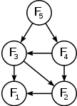 Le graphe de dépendance montré sur la droite n'est pas un arbre : cela illustre que les sous-problèmes se chevauchent. Par exemple, pour calculer F5, nous avons besoin de F3 et F4. Mais pour calculer F4, nous avons besoin de F2 et F3. Ainsi, F3 est utile à la fois pour le calcul de F4 et pour le calcul de F5. La programmation dynamique consiste alors à stocker les valeurs des sous-problèmes pour éviter les recalculs[3]. Il existe alors deux méthodes pour calculer effectivement une solution : la méthode ascendante et la méthode descendante. Dans la méthode ascendante, on commence par calculer des solutions pour les sous-problèmes les plus petits, puis, de proche en proche, on calcule les solutions des problèmes en utilisant le principe d'optimalité et on mémorise les résultats dans un tableau F[.]. Par exemple :