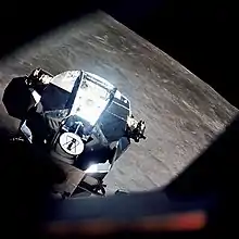 L'étage de remontée pèse environ 4,5 tonnes. Sa forme complexe, qui résulte d'une optimisation de l'espace occupé, lui donne l'allure d'une tête d'insecte. Il est essentiellement composé de la cabine pressurisée qui héberge deux astronautes dans un volume de 4,5 m3 et du moteur de remontée avec ses réservoirs d'ergols. La partie avant de la cabine pressurisée occupe la plus grande partie d'un cylindre de 2,34 mètres de diamètre et de 1,07 mètre de profondeur. C'est là que se tient l'équipage lorsqu'il n'est pas en excursion sur la Lune. Le pilote (à gauche face à l'avant) et le commandant de bord sont debout, tenus par des harnais qui les maintiennent en place en impesanteur et durant les phases d'accélération. Sur la cloison avant, chaque astronaute a devant lui un petit hublot triangulaire (0,18 m2)[alpha 10] incliné vers le bas, qui lui permet d'observer le sol lunaire avec un bon angle de vision, ainsi que les principales commandes de vol et cadrans de contrôle regroupés par panneaux généralement dédiés à un sous-système. Les commandes et contrôles communs sont placés entre les deux astronautes (par exemple la console d'accès à l'ordinateur de navigation), certaines commandes sont doublées (commandes pilotant l'orientation et la poussée des moteurs), les autres commandes sont réparties en fonction des tâches assignées à chaque astronaute. Les panneaux de commandes et coupe-circuit se prolongent sur les parois latérales situées de part et d'autre des astronautes[57].