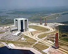 Le centre spatial Kennedy (KSC), situé sur l'île Meritt en Floride, est le site d'où sont lancées les fusées géantes du programme Apollo. La NASA, qui a besoin d'installations à l'échelle de la fusée Saturn V, met en construction en 1963 cette nouvelle base de lancement qui jouxte celle de Cap Canaveral appartenant à l'Armée de l'Air américaine et d'où sont parties, jusqu'alors, toutes les missions habitées et les sondes spatiales de l'agence spatiale[18]. Le centre effectue la qualification de la fusée assemblée (« all up ») et contrôle les opérations sur le lanceur jusqu'à son décollage. Il emploie en 1965 environ 20 000 personnes. Au cœur du centre spatial, le complexe de lancement 39 comporte deux aires de lancement et un immense bâtiment d'assemblage, le VAB (hauteur 140 mètres), dans lequel plusieurs fusées Saturn V peuvent être préparées en parallèle. Plusieurs plates-formes de lancement mobiles permettent de transporter la fusée Saturn assemblée jusqu'au site de lancement. Le premier lancement depuis le nouveau terrain est celui d'Apollo 4, en 1967. Jusqu'en 2011, le complexe était utilisé pour lancer la navette spatiale américaine[15],[19].