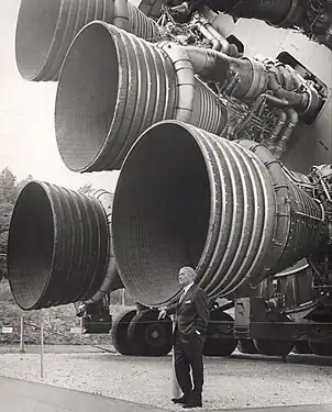 La mise au point du moteur F-1, d'architecture conventionnelle mais d'une puissance exceptionnelle (690 tonnes de poussée, 2,5 tonnes d'ergols brûlés par seconde) fut très longue à cause de problèmes d'instabilité au niveau de la chambre de combustion qui ne furent résolus qu'en combinant études empiriques (comme l'utilisation de petites charges explosives dans la chambre de combustion) et travaux de recherche fondamentale[25]. Le deuxième étage de la fusée Saturn V, qui constituait déjà un tour de force technique du fait de la taille de son réservoir d'hydrogène liquide, eut beaucoup de mal à faire face à la cure d'amaigrissement imposée par l'augmentation de la charge utile au fur et à mesure de son développement[26]. Mais les difficultés les plus importantes touchèrent les deux modules habités du programme : le CSM et le module lunaire Apollo. Le lancement du développement du module lunaire avait pris un an de retard à cause des atermoiements sur le scénario du débarquement lunaire. Il s'agissait d'un engin entièrement nouveau, pour lequel aucune expérience antérieure ne pouvait être utilisée, par ailleurs très complexe du fait de son rôle. Les problèmes multiples — masse nettement supérieure aux prévisions initiales, difficulté de mise au point des logiciels indispensables à la mission, qualité déficiente, motorisation — entraînèrent des retards tellement importants qu'ils mirent à un moment en danger la tenue de l'échéance du programme tout entier[27],[28],[29],[30].