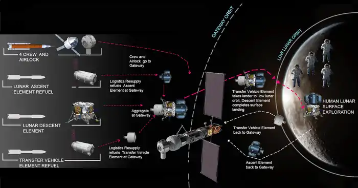 Pour remplir les objectifs ambitieux du programme Artemis dans le délai très court qui lui est imposé, la NASA sous-traite de manière particulièrement marquée la conception de composants importants (vaisseau lunaire HLS, modules de la station spatiale LOP-G, atterrisseurs des missions robotiques) ainsi que les prestations de lancement de ces engins et de ravitaillement de la station spatiale. En , le développement du HLS est confié à la société SpaceX, qui proposait une version de son Starship baptisé Starship HLS. Selon le programme établi en , puis modifié en janvier 2024, Artemis III, lancée en 2026, sera la première mission qui amènera un équipage mixte de deux astronautes sur la Lune pour un séjour d'une durée de six jours et demi. Après cette date doivent être menées des missions caractérisées par des séjours plus longs, un équipage au sol de quatre personnes au lieu de deux, davantage d'équipements permettant d'étoffer le retour scientifique. Le vaisseau lunaire sera alors partiellement réutilisable. Les sites d'atterrissage retenus pour toutes ces missions se situent au pôle Sud de la Lune car les réserves de glace d'eau présentes dans les cratères perpétuellement à l'ombre présentent un intérêt stratégique dans la perspective de missions de longue durée.