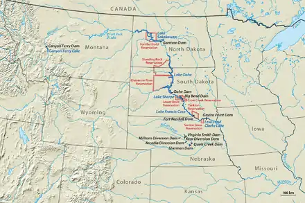 La construction de barrages tels que l’Oahe, le Garrison et Fort Randall a inondé des parties importantes de nombreuses réserves amérindiennes, y compris celles de Standing Rock, Cheyenne River, Fort Berthold, Crow Creek (en) et Lower Brulé (en).