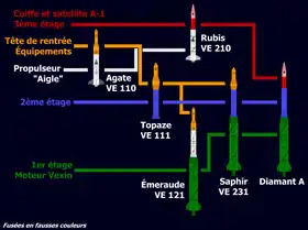 - Les fusées Rubis (6 tirs de qualification dont 2 échecs) qualifient le 3e étage de la fusée Diamant, la séparation de la coiffe et du 3e étage ainsi que le système de stabilisation et les procédures de suivi de satellisation.