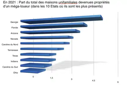 De son côté, en 2021, le lobby de la location de maisons unifamiliales à grande échelle (NRHC) nie que les grands propriétaires accaparent une part significative des maisons, et qu'ils influent réellement sur les prix du marché, car à l'échelle du pays, lors « de la grande récession de 2007-2011, les sociétés de location de maisons unifamiliales ont acheté environ 2 % des maisons vendues par le biais de saisies et de ventes à découvert », et toujours selon le NRHC, en 2020, « les sociétés de location de maisons unifamiliales ont représenté moins de 0,14% des maisons achetées ». Mais le NRHC reconnait des taux plus importants dans les 10 États où les mégaloueurs sont les plus présents (Cf. graphique ci-contre). Et ses détracteurs notent que ces maisons sont justement celles qui étaient les plus recherchées et que grâce à leurs algorithmes et à leurs moyens financiers, les méga-propriétaires éliminaient les citoyens normaux du jeu de la concurrence.