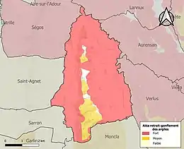 Le retrait-gonflement des sols argileux est susceptible d'engendrer des dommages importants aux bâtiments en cas d’alternance de périodes de sécheresse et de pluie. 97,6 % de la superficie communale est en aléa moyen ou fort (94,5 % au niveau départemental et 48,5 % au niveau national). Sur les 91 bâtiments dénombrés sur la commune en 2019, 79 sont en aléa moyen ou fort, soit 87 %, à comparer aux 93 % au niveau départemental et 54 % au niveau national. Une cartographie de l'exposition du territoire national au retrait gonflement des sols argileux est disponible sur le site du BRGM[21],[Carte 3].