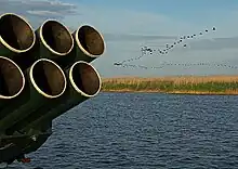 Au centre du navire se trouve un lance-roquettes multiples BM-14 rotatif de 140 mm avec 17 tubes de 1100 mm de long, placés en deux rangés de 9 (supérieure) et 8 (inférieure) respectivement, pour lequel une réserve de 34 roquettes est prévue, rangées principalement sur le pont du navire. Le lanceur doit être rechargé à la main ; n'étant pas stabilisé, il ne peut tirer que lorsque le bâtiment est à l'arrêt[11].