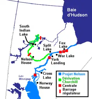 De plus, le fleuve Churchill, qui se trouve à environ 160 km au nord, est dérivé vers le fleuve Nelson depuis 1977. Du lac Southern Indian sur le fleuve Churchill, le Nelson reçoit en moyenne 760 m3/s d’eau, soit 60 % du débit naturel du Churchill dont la superficie du bassin versant du cours supérieur s’élève à environ 230 000 km2. Le débit du fleuve Nelson aménagé atteint maintenant environ 3 130 m3/s. L’exutoire naturel du lac Winnipeg a aussi été aménagé afin d'augmenter la production hydroélectrique des centrales du Nelson en hiver.