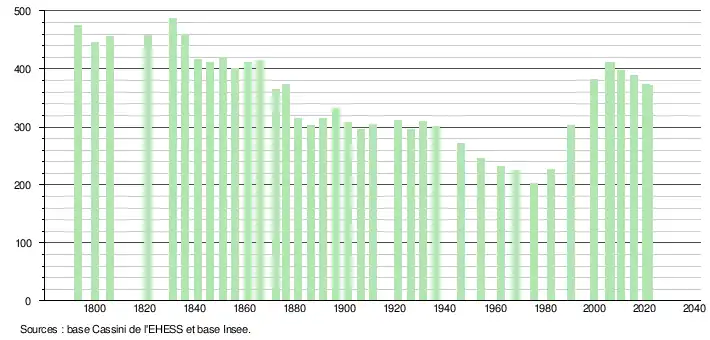 L'évolution du nombre d'habitants est connue à travers les recensements de la population effectués dans la commune depuis 1793. Pour les communes de moins de 10 000 habitants, une enquête de recensement portant sur toute la population est réalisée tous les cinq ans, les populations légales des années intermédiaires étant quant à elles estimées par interpolation ou extrapolation[34]. Pour la commune, le premier recensement exhaustif entrant dans le cadre du nouveau dispositif a été réalisé en 2005[35].