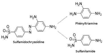Dès la fin de 1935, dans le laboratoire de chimie thérapeutique dirigé par Ernest Fourneau à l’Institut Pasteur, Jacques et Thérèse Tréfouël, Federico Nitti et Daniel Bovet établirent que la sulfamidochrysoïdine se métabolise en para-aminophénylsulfamide, molécule incolore et plus simple que le Prontosil, et ils montrèrent que ce 1162 F était l’agent actif du médicament[9], tandis que Gaston Roussel négociait une licence avec le laboratoire allemand afin de commercialiser en France le Prontosil sous le nom de « Rubiazol[10],[11] ».