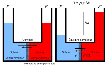 Lorsque l'on place un solvant pur et une solution d'un soluté quelconque dans le même solvant de part et d'autre d'une membrane semi-perméable (ne laissant passer que le solvant), le solvant migre spontanément à travers la membrane du compartiment A contenant le solvant pur vers le compartiment B contenant la solution : ce phénomène est appelé osmose. Au bout d'un certain temps la migration du solvant cesse et un équilibre s'établit entre les deux compartiments. À l'équilibre osmotique la membrane subit une pression plus importante de la part de la solution que de la part du solvant pur ; le solvant migre donc du compartiment de plus faible pression, le compartiment A, vers celui de plus forte pression, le compartiment B.