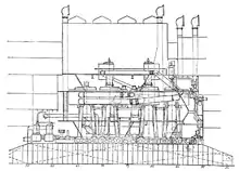 - des turbines couplées à des alternateurs alimentant en énergie électrique tout le bâtiment, et éventuellement des moteurs électriques de propulsion (propulsion électrique).