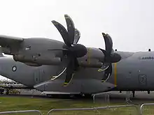 Le turbopropulseur[Note 1] est un turbomoteur dont la turbine entraîne une hélice dont le plan de rotation est vertical. Le turbopropulseur est généralement double-corps, c'est-à-dire qu'il dispose de deux turbines en sortie qui font tourner deux arbres coaxiaux. La première turbine est reliée au compresseur, dite « de régénération », et la seconde est reliée à l'hélice, dite « de puissance ». Le turbopropulseur a été difficile à mettre au point, car il associe les difficultés du turboréacteur et de l'hélice. Son rendement est supérieur à celui du turboréacteur, mais son utilisation est limitée par la baisse de rendement de l'hélice au-delà de Mach 0,7 et au-delà de 8 000 mètres d'altitude. C'est le mode de propulsion optimal pour les avions de transport commerciaux sur des distances courtes (une heure de vol, 400 km), quand la durée de vol à haute altitude est trop courte pour qu'un avion à réaction fasse la différence. Beaucoup d'avions de transport régionaux, de type ATR 42 et ATR 72, en sont équipés.