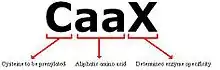 Les motifs de type « boîte CaaX » sont les sites de prénylation des protéines les plus courants, les groupes prényle se liant aux résidus de cystéine des boîtes CaaX[2],[3]. Le motif CaaX est composé de quatre résidus d'acides aminés : C représente une cystéine ; a représente un acide aminé aliphatique quelconque ; et X représente un résidu dont la nature détermine le type de prénylation devant survenir sur la protéine : s'il s'agit d'un résidu d'alanine, de méthionine, de sérine ou de glutamine alors la protéine sera farnésylée par une farnésyltransférase (en), tandis que s'il s'agit d'un résidu de leucine alors la protéine sera géranylgéranylée par une géranylgéranyltransférase de type 1[3],[4]. Ces deux enzymes sont semblables, chacune contenant deux sous-unités[6].