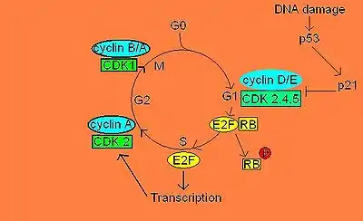 Cependant, il peut aussi y avoir une régulation négative de pRB. En effet, s’il y a des dommages à l’ADN lorsque la cellule veut entrer en mitose, la protéine p53 se trouve phosphorylée et induit la production de protéine p21. p21 se lie aux complexes cycline/CDK de la phase G1, inhibant ainsi leur activité kinase pour pRB. Il y a donc inhibition de la libération du complexe E2F/DP[8].