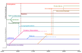En Angleterre, les convenances personnelles du roi Henri VIII en matière matrimoniale le conduisent à rompre avec Rome. Née de ce schisme, l'Église anglicane conserve d'abord tous les aspects extérieurs du catholicisme mais évoluera graduellement vers le protestantisme tandis que le catholicisme poursuit son évolution divergente par le biais des doctrines promulguées après la rupture[24]. En Suisse, les cantons s'étaient déterminés séparément, les plus vastes et les plus puissants (Bâle, Zurich, Berne) basculant vers le protestantisme[24]. En Europe du Sud, les velléités du luthéranisme avaient été éteintes par l'Inquisition. Seule exception notable, la communauté hérétique dite vaudoise : lors du synode de Chanforan, la majeure partie de l'Église vaudoise choisit d'adhérer à la Réforme en 1532. Malgré les persécutions (entre autres le massacre de trois mille Vaudois du Luberon en 1545), cette petite communauté s'est maintenue dans le Piémont[24]. Le protestantisme connaît ensuite une expansion mondiale au travers des mouvements missionnaires qui, le plus souvent, accompagnent la colonisation. Dans le cas des États-Unis, il est alimenté en outre par l'exil des non-conformistes religieux d'Angleterre ou d'autres régions d'Europe : ainsi les quakers puis les non-conformistes anglicans (puritains) sont-ils très tôt et très largement implantés dans le Nouveau Monde, mais c'est le cas aussi des anabaptistes germaniques (allemands, suisses, alsaciens) qui fondent les communautés mennonites et amish aux États-Unis[24].