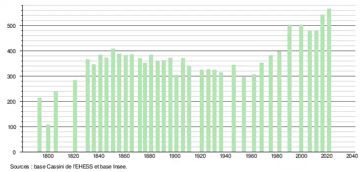 L'évolution du nombre d'habitants est connue à travers les recensements de la population effectués dans la commune depuis 1793. Pour les communes de moins de 10 000 habitants, une enquête de recensement portant sur toute la population est réalisée tous les cinq ans, les populations légales des années intermédiaires étant quant à elles estimées par interpolation ou extrapolation[32]. Pour la commune, le premier recensement exhaustif entrant dans le cadre du nouveau dispositif a été réalisé en 2006[33].