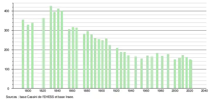 L'évolution du nombre d'habitants est connue à travers les recensements de la population effectués dans la commune depuis 1793. Pour les communes de moins de 10 000 habitants, une enquête de recensement portant sur toute la population est réalisée tous les cinq ans, les populations légales des années intermédiaires étant quant à elles estimées par interpolation ou extrapolation[21]. Pour la commune, le premier recensement exhaustif entrant dans le cadre du nouveau dispositif a été réalisé en 2005[22].
