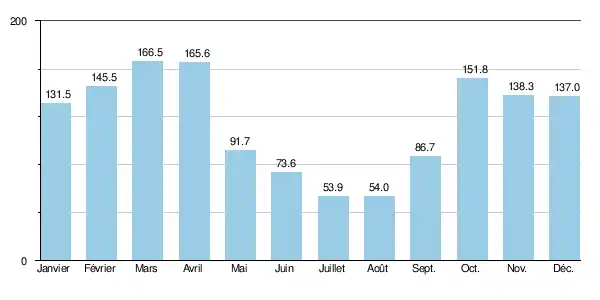 | Précipitations (mm) | 124 | 163,9 | 176,2 | 214,7 | 152,5 | 100,4 | 82,9 | 70,2 | 144 | 120,6 | 174,2 | 87,7 | 1 611,3 |