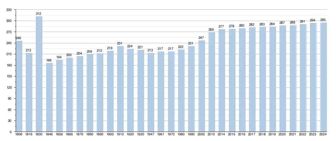 En tenant compte des anciennes communes entraînées dans la fusion de communes de 1977, on peut dresser l'évolution suivante[5] (Nombre d'habitants × 1000) :
