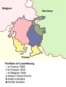 De l'autre côté de la frontière, l'union personnelle entre le grand-duché et le roi des Pays-Bas perdura jusqu'au , date de la mort de Guillaume III sans héritier mâle, ce qui mena à la création du Luxembourg tel qu'il existe aujourd'hui.